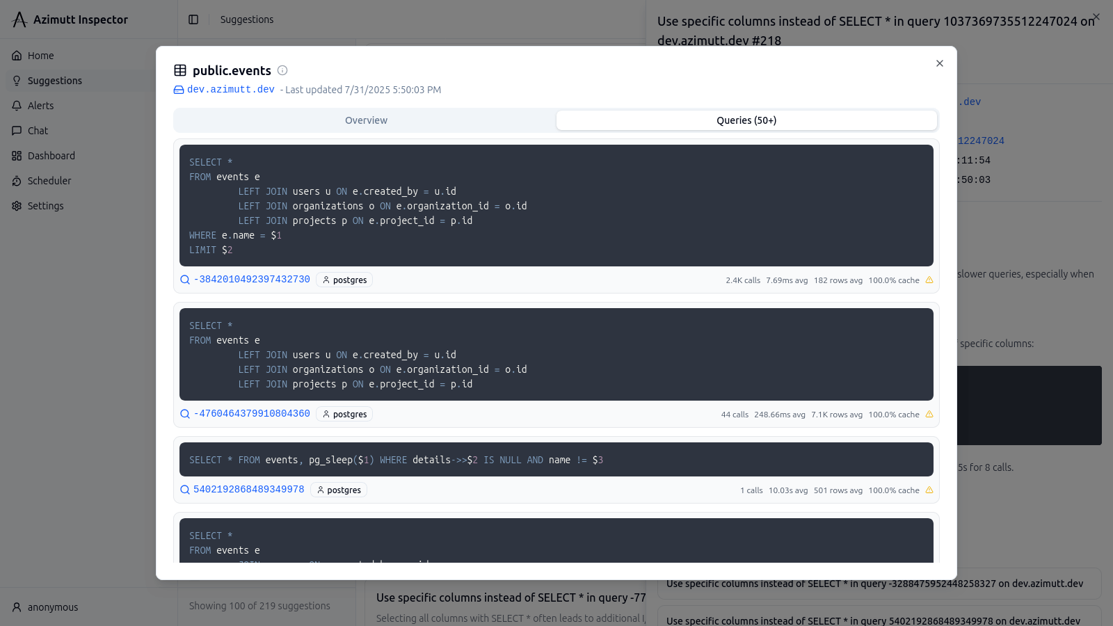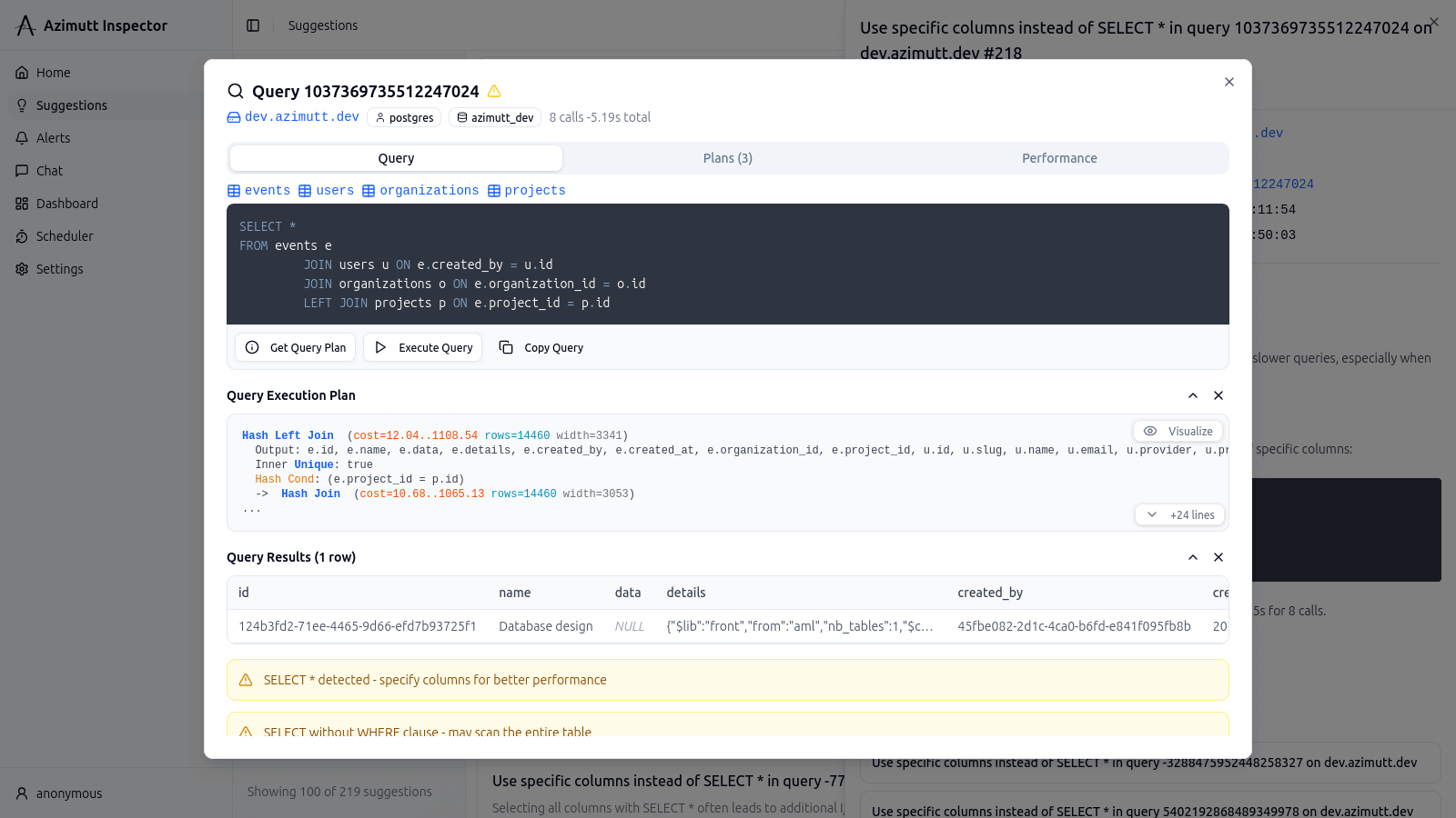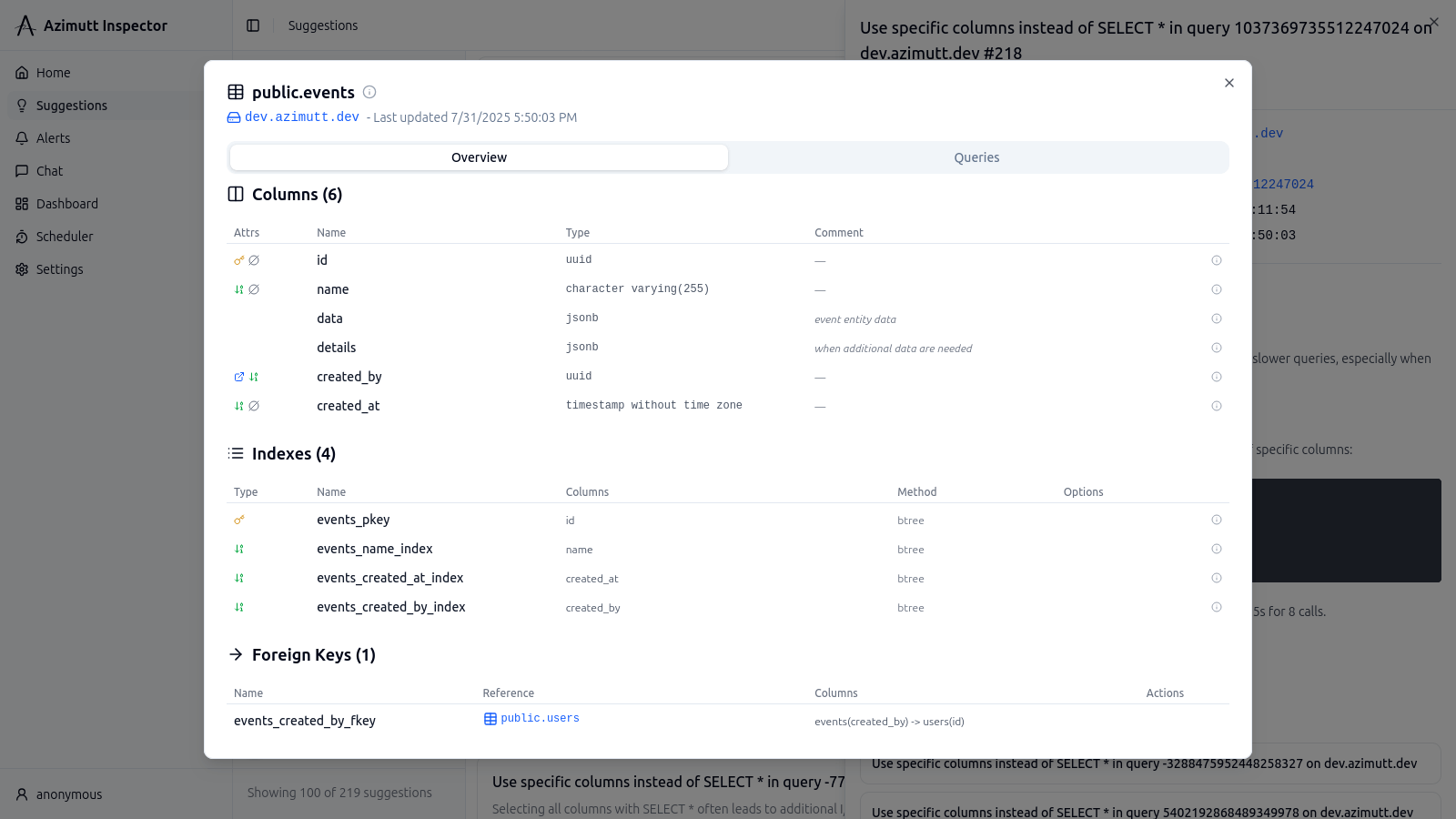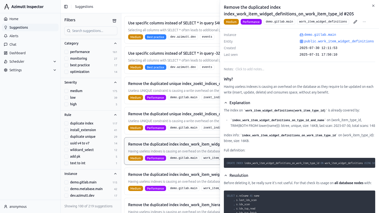 Azimutt Inspector combines expert heuristics and AI to surface risks early, detecting query/schema issues with actionable & pedagogical suggestions.