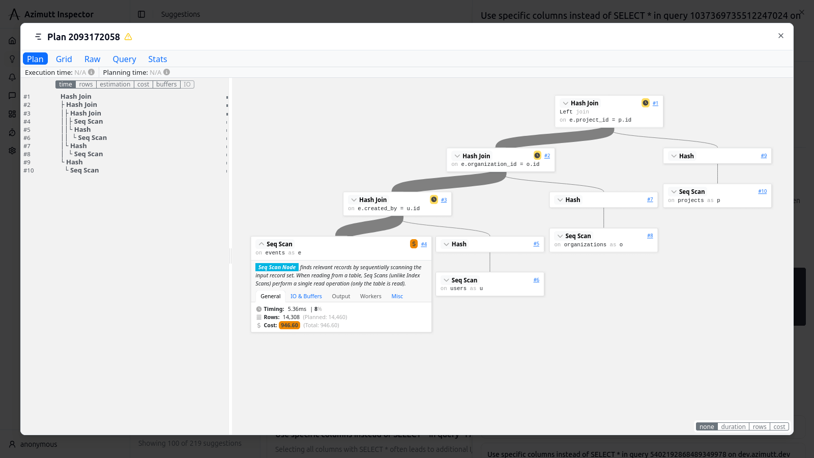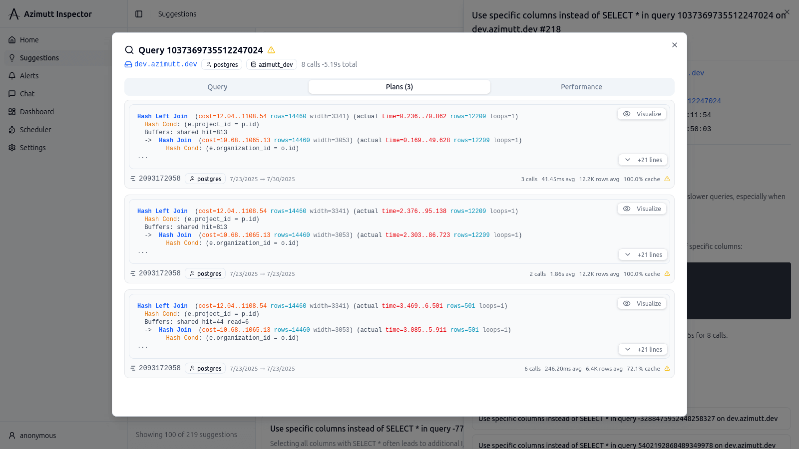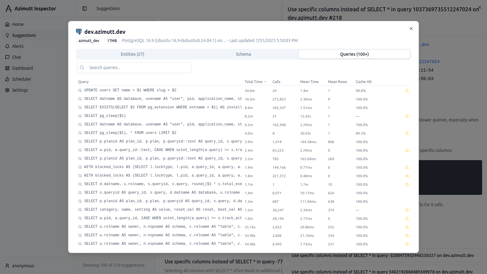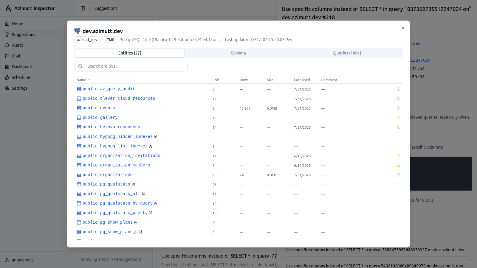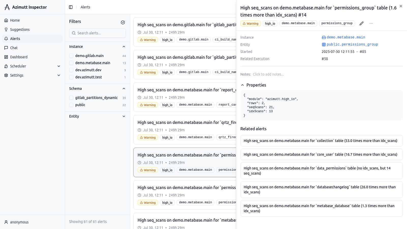 Azimutt Inspector combines expert heuristics and AI to surface risks early, detecting query/schema issues with actionable & pedagogical suggestions.